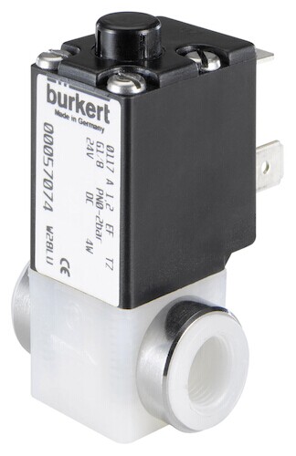 0117型是常闭直动柱塞式电磁阀, 带 PTFE 隔膜。隔膜用来隔离流体和线圈。断电时(电路功能A),在弹簧力作用下阀门关闭。通电时,电磁阀为 2/2-Way, G 1/8, UNF 1/4-28,流体控制系统在反弹簧力作用下阀门打开。电磁阀环氧树脂封装有效地消散由线圈产生的热量。