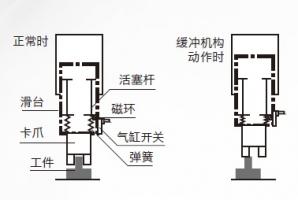 气缸前进时,即使驱动部和工件碰触,缓冲机构也会动作,是保护工件与气缸的型号。拾放等前端需使用缓冲机构等情况下有效。